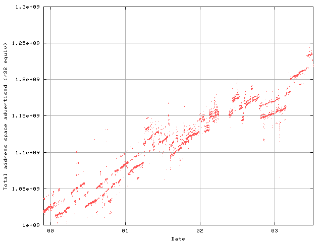 Returning to the view of total announced address space, as gathered from the perspective of AS1221, it is possible to plot a time series of the smoothed BGP data.