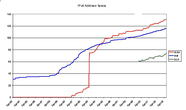 In this article I'd like to revisit a particular piece of analysis that has been a topic of considerable interest at various times over the past decade or more. The basic question is "how long can the IPv4 address pool last in the face of a continually growing network?" We've seen in the industry press at regular intervals dire reports that the IPv4 sky is falling and somewhere on the globe they've "'run out" of addresses. Once again it's probably time to take a more considered look at the problem and see what numbers come out from this exercise using data collected up to 2003.