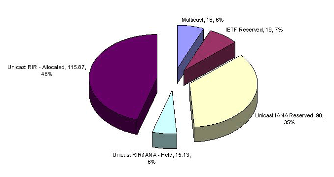 Some 29% of the space is announced in the BGP routing table, while 17% has been allocated to an end user or LIR but is not announced on the public Internet as being connected and reachable. 6% of the address space is held by the RIR's pending assignment or allocation (or at least there is no RIR recorded assignment of the space), while 35% of the total space remains in the IANA unallocated pool. A further 6% of the space is held in reserve by the IETF.