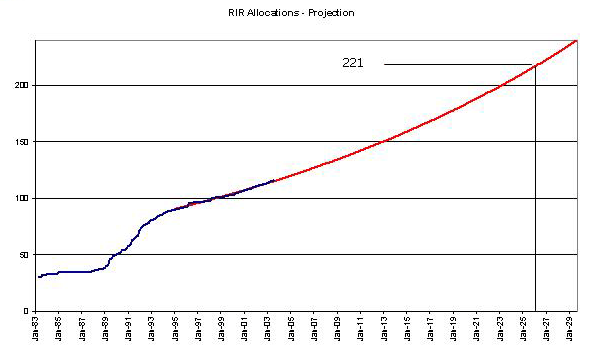 This form of extrapolation gives a date of 2026 for the time at which the RIR's will exhaust the number pool. If the withheld 16 /8's are bought into play, 2029 would be predicted by this approach.