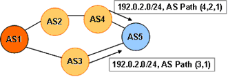 The AS Path is used as a path metric in BGP’s path selection algorithm. The default route selection metric in BGP is that of selection of the minimal length AS Path, with each AS in the path counting as a single unit of ‘cost’. When a BGP speaker receives two or more advertisements for the same address prefix, the default selection mechanism is to prefer the advertisement with the minimal AS Path length. In the case of the example network in Figure 1, AS 5 will prefer to use the path via AS3 to reach the originating AS1, in preference to the longer path of AS4 then AS2.