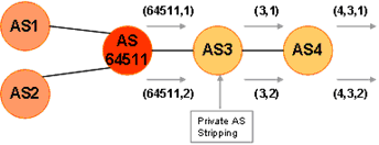 In the case where a network has a single upstream connection then the routing policies of the network are precisely the same as those of its upstream service provider, and there would normally be no need for the network to use a distinct AS number. Even if the network domain uses BGP for its upstream connection, the originating domain can use a private AS number (from the number range 64512 - 65534) to support the BGP session to the upstream network. The upstream network will strip off the private AS number when it readvertises the prefix, and the upstream network would appear to the rest of the Internet as the originating AS. Even if the AS has “downstream” networks it can still use a private AS, even when the downstream AS’s are using public AS numbers. The stripping of the private AS only removes the instances of the private AS from the AS path, not the public AS numbers. (Figure 3)