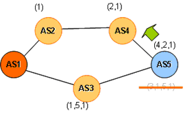 A more subtle, and more controversial, prepending technique is that of so-called AS Path Poisoning, where an AS uses some other value to prepend in the AS Path. In the example below AS1 wants to express the policy that under no circumstances should AS5 use the transit via AS3 to reach AS1. In this case AS1 could use AS5 as the prepending value in its advertisement to AS3. When AS5 receives this advertisement, the presence of its own AS number in the AS Path means that it will not accept this advertisement, and will prefer the transit path via AS4 and AS2. The difference between these two examples is that in the case where the connection between AS1 and AS2 is broken none of AS2, AS4 or AS5 can possibly reach AS1 when this AS Path Poisoning technique is being used.