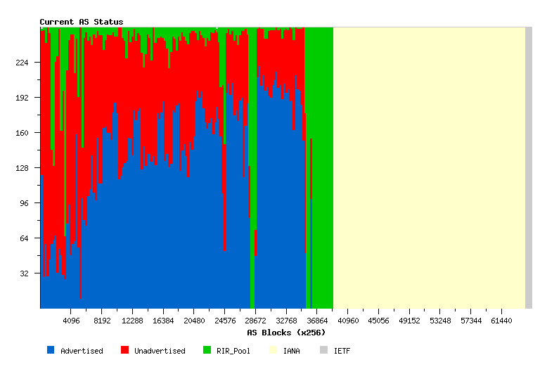Interestingly the older AS number blocks appear to have a much higher amount of unadvertised ASs than more recent AS number blocks. Another way to look at his is to examine the age distribution of