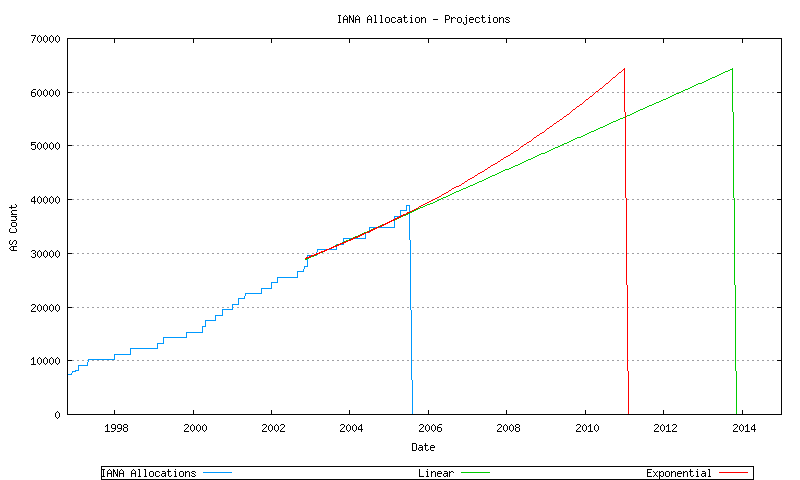 At this point is now possible to make some projections on AS number consumption. The technique here is to use the available data from a starting point of the start of 2003 and using a least squares best fit to the data generate trend data series. This trend data is then projected forward in time to forecast the point in time when the resource reaches a certain threshold point.