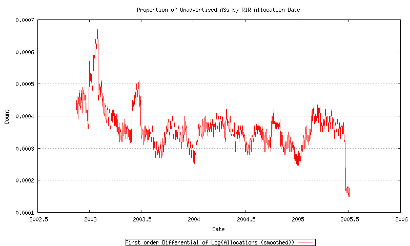 These allocated AS’s are then assigned to ISPs by the RIRs, and a second time series can be generated, showing the rate of AS assignment to ISPs and Local Internet Registries. This allocation time series is shown in Figure 7. Again the series shows the effects of the Internet boom across the period from 1999 through to late 2001. The subsequent market correction is also evident, which was visible in the AS allocation rate change by early 2002.