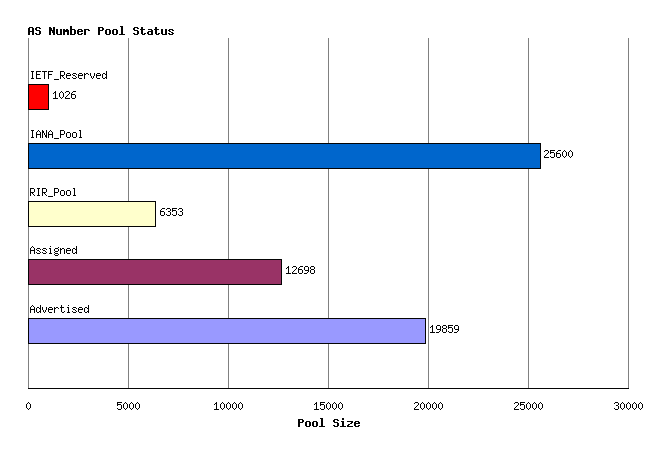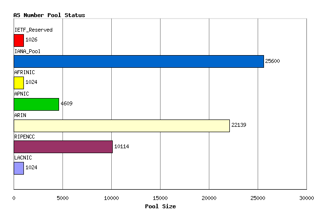 As of July 2005 the IANA is holding 25,600 numbers, while 38,910 numbers have been allocated to the RIRs. The overall picture of the AS number space is shown in Figure 1.