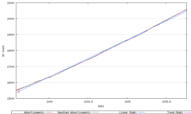 The current count of advertised AS numbers is some 20,000, as of July 2005. This time series has a visible correlation to the recent Internet business cycles, with a sharp upward trend across the Internet boom period of 1999 – 2001, and a marked change in the trend in early 2001. Since that date the rate of increase of AS numbers has been far slower.