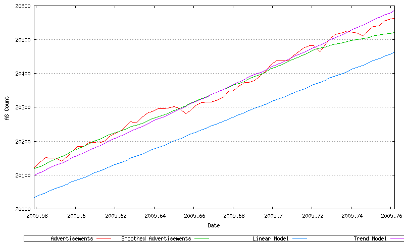 The next data sequence to examine is that of the advertised AS data series. A projection of Linear and Trend (exponential) models onto the data is shown below.