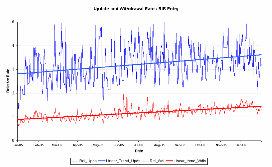 It is possible to use this predictive model to also forecast the amount of BGP update activity. In this model the starting point is the trend of the number of prefix updates and withdrawals per BGP routing table entry across 2005