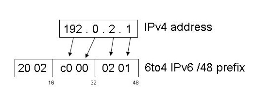 The 6to4 mapping is performed by using a 6to4 16 bit address prefix, 2002::/16, then appending a 32 bit IPv4 address to the prefix to form a 6to4 site address. For example the IPv4 address 192.0.2.1 is mapped by 6to4 into the IPv6 address prefix of 2002:c000:201::/48.
