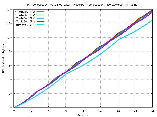 In this case the rate acceleration of an IPv6 TCP session in congestion avoidance mode, using an MTU of 1280 and an RTT of 24ms is some 16% slower than an IPv4 session using an MTU of 1500 over the same path.