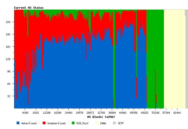 Each column represents 256 AS Numbers. Each column shows the number of AS numbers visible in BGP (blue), the number allocated but not routed (red), the number held by an RIR in an unallocated pool (green), the number held by the IANA in the IANA unallocated pool (cream) and the number reserved by the IETF (grey).