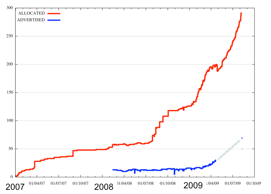 However a look at the RIRs' AS number allocation data paints a different picture. In 2009 the policy intention was that we would now be at the stage where 32 bit AS numbers were the default, and as the year progressed the number of 16 bit AS numbers being allocated was to dwindle off to a very small number. In the period 1 January to 12 August 2009 the RIRs allocated 2,683 AS numbers, of which 2,514 were 16-bit AS Numbers and only 169 were 32-bit AS Numbers. In total, since 1 January 2007, the RIRs have allocated 291 AS Numbers, of which only 70 can be seen in the BGP routing table. (Figure 8, Figure 9)