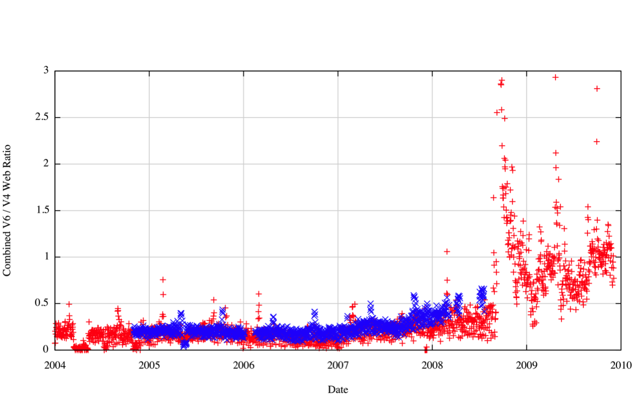 Figure 32 shows the daily ratio of IPv6 to IPv4 source addresses that have accessed the APNIC and RIPE websites since 1 January 2004. IPv6 users seem to have started to increase in 2007 and even more so mid-2008, to reach 1% of visits at year-end 2009. Given the considerable variation in the data from day to day, a scatter plot is used to ensure that the trends in the data are visible as well as the day-to-day variation.