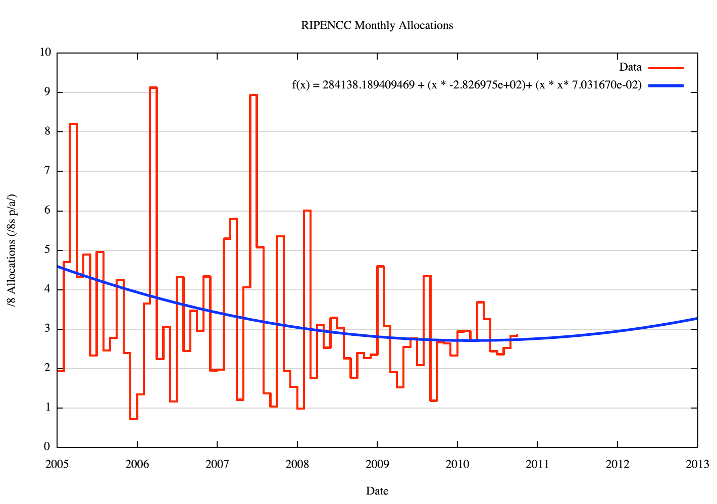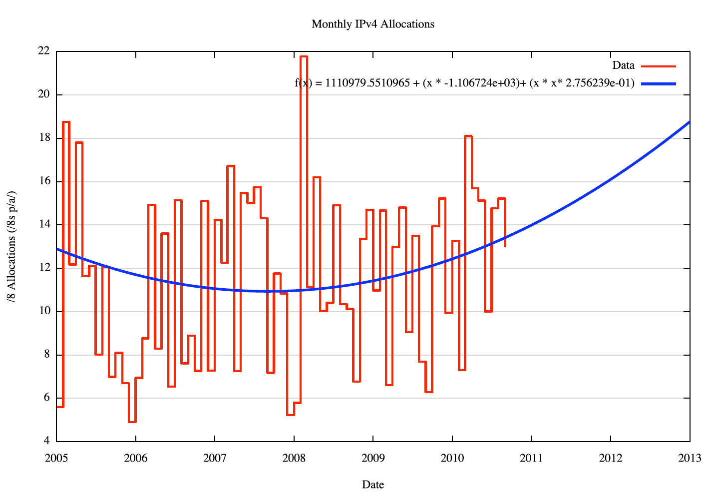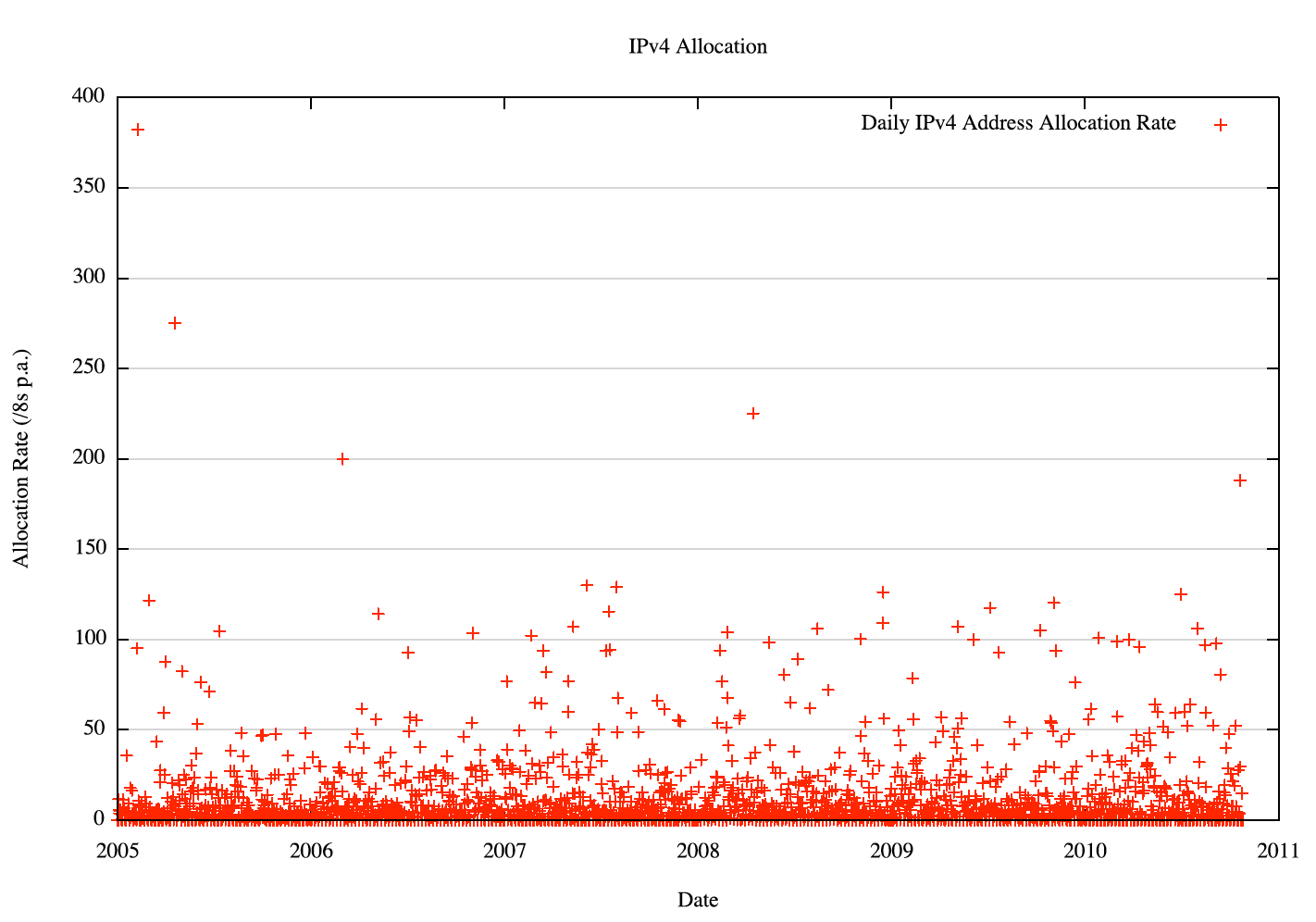 If we want to understand when we are going to run down the address pool then we are not looking at the average of some 7,000 individual allocations per year, but the likely timing of the largest 20 or so transactions each year, and in the time remaining between now and exhaustion of the pool we are looking at the timing of the next 10-20 such large transactions, as they will effectively determine the date when the available address pool is exhausted.