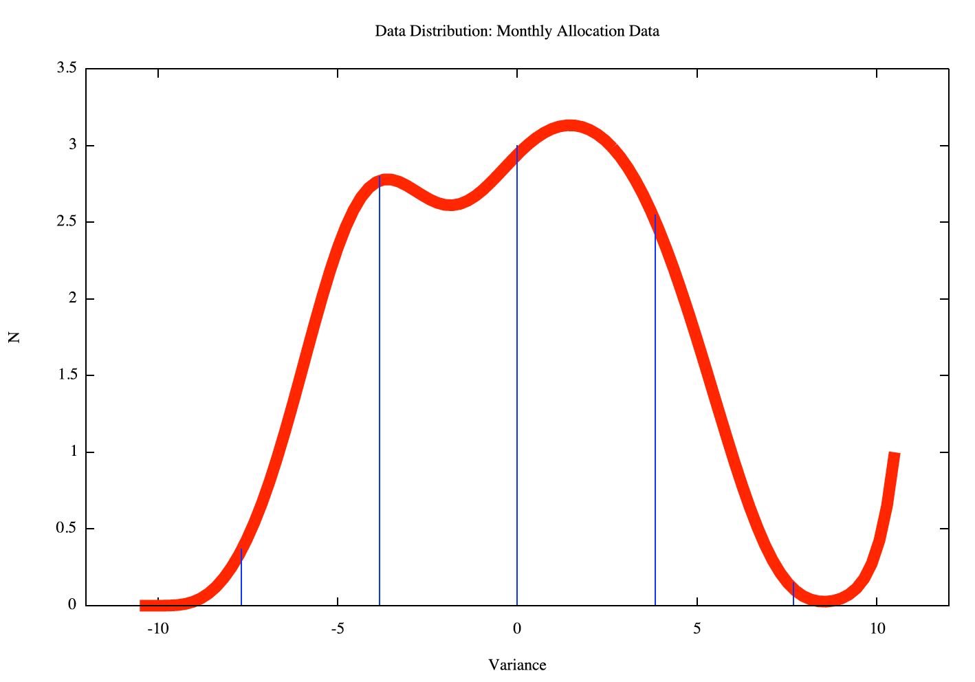 An analysis of the variance of this data is show in Figure 4, showing a smoothed plot of the distribution of variance from the curve fit, over the period 2005 - 2009. The distribution of data is close to a normal distribution, with a heavy tail on the positive variance, as is expected in an data set where the negative variance is bounded by the zero point and the positive variance is bounded by indirect constraints that admit a significantly higher level of potential variance.