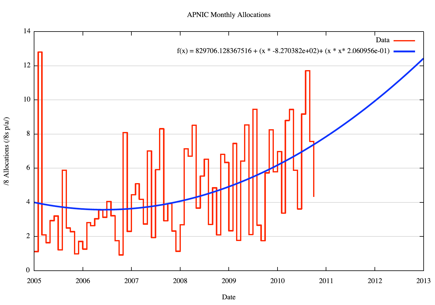 The first step is to create a model of address consumption for each RIR. The same technique as shown above, namely of constructing a base data set of monthly allocations for each RIR, and then linear regression is used to find an O(2) polynomial best fit to the data.