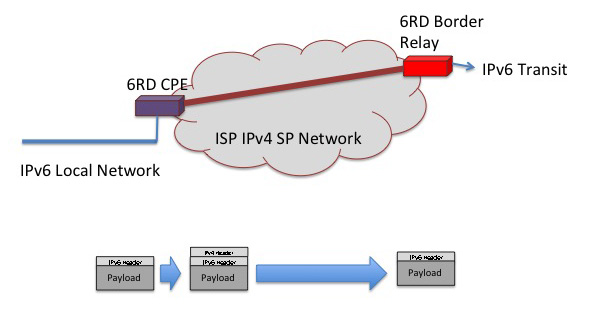 The 6RD approach has many similarities to MPLS, in that an additional header is added to incoming packets at the network’s boundary, and the encapsulation effectively directs the packet to the appropriate network egress point (as identified by ingress), where the encapsulation is stripped and the original packet is passed out.