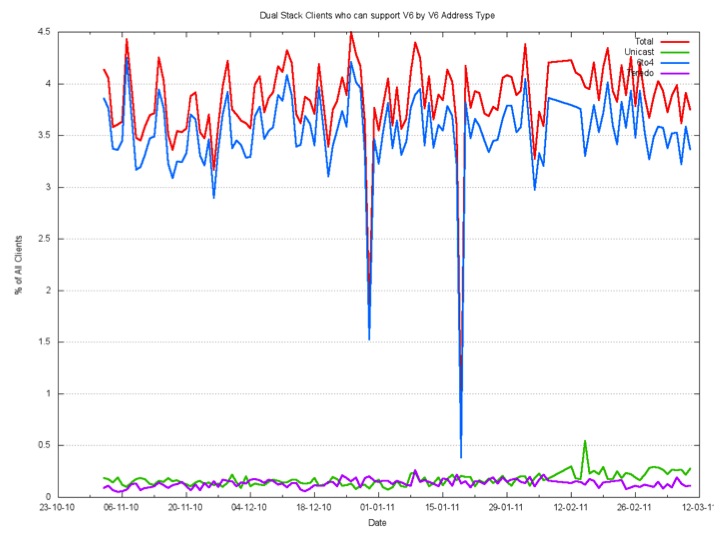 Around one in ten thousand, or some 0.01% of clients, will use Teredo to access a dual stack object with IPv6.