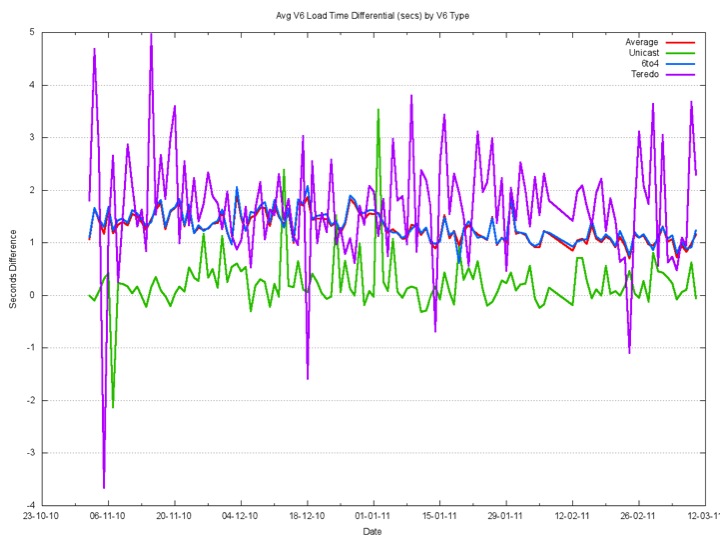 The time to perform the fetch of the object was taken, and the time to perform the fetch in IPv4 was taken as the base level for each client. While the performance of 6to4 was consistently some 1.2 seconds longer on average than IPv4, the Teredo performance was seen to be highly variable, with average times up to 3 seconds longer than IPv4.