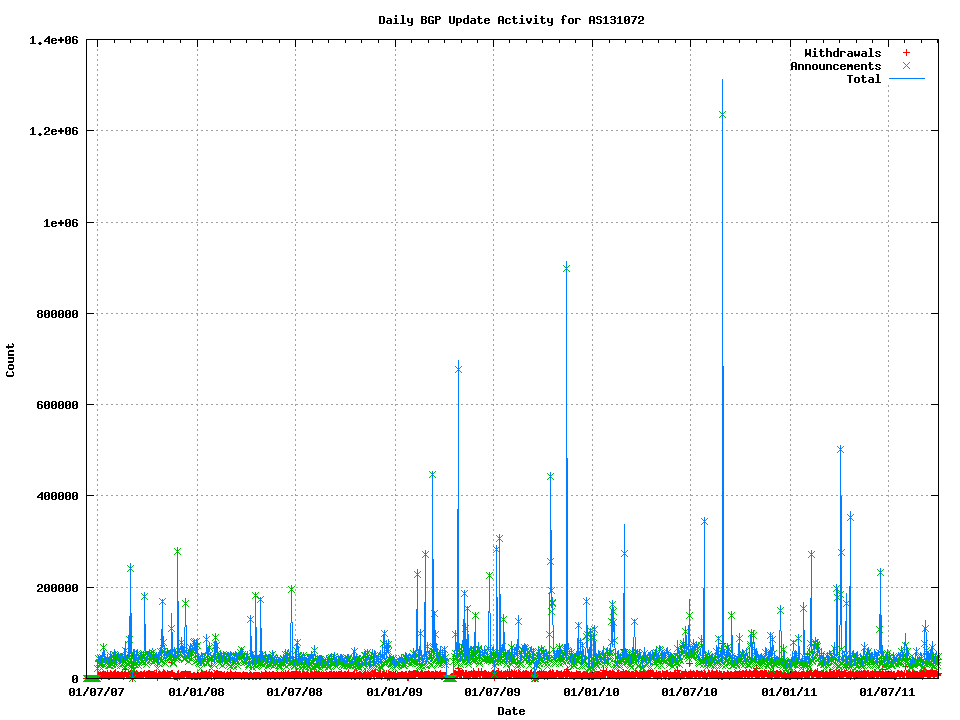 In attempting to address these questions I have used a data set that includes every BGP update over a period of several years at AS 131072. Before examining the data I should note the circumstances this AS. It lies at the edge of the network, and does not provide transit to any other network. Secondly, it is a single LAN, so there is no internal routing protocol, nor any iBGP within the network. Thirdly, the data collected and analyzed here relates to a single eBGP session. So what we are examining here is a pretty typical edge network's eBGP feed that has been stable over an extended period of time.