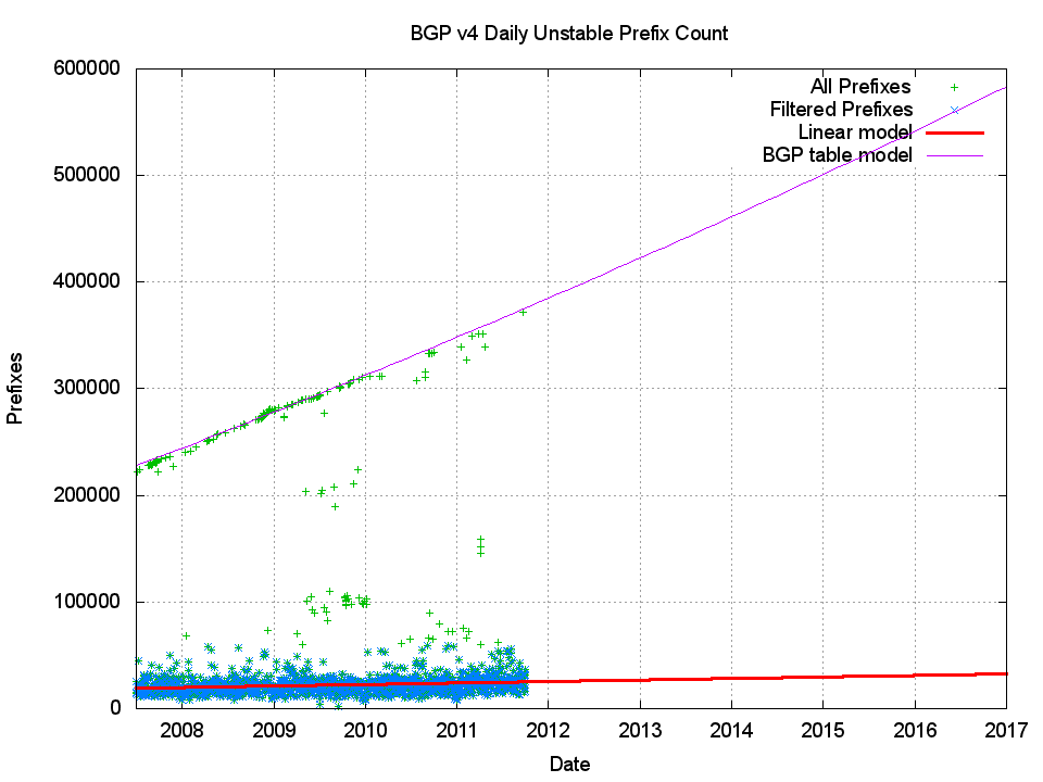 This is a very surprising outcome. BGP routing table has grown from some 220,000 entries in July 2007 to some 380,000 entries in October 2011, or a relative size difference of 73%. But at the same time the number of unstable prefixes per day has grown extremely slowly. At the start of 2008 there were an average of 19,843 unstable prefixes per day (+/- some 10,000 prefixes), and by the start of 2012 there are projected to be 25,472 unstable prefixes per day. The comparable growth in the average number of unstable prefixes over the same period is 25%, or one third of the growth in the number of prefixes in the routing table.