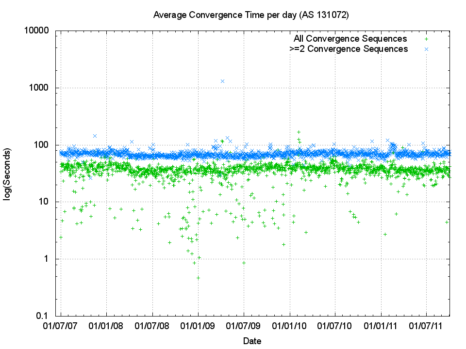 The trend in the number of these 'instability' events appears to be relatively constant on a daily basis. In other words the network as a whole appears to be no more or less unstable now as it was in 2007, with around 60,000 ± 20,000 such convergence events per day, and 10,000 events per day that require 2 or more updates to converge to stability. Figures 7 and 8 similarly illustrate that the trends of average daily convergence sequence length and duration are not changing over time, but have ben extremely steady over time.