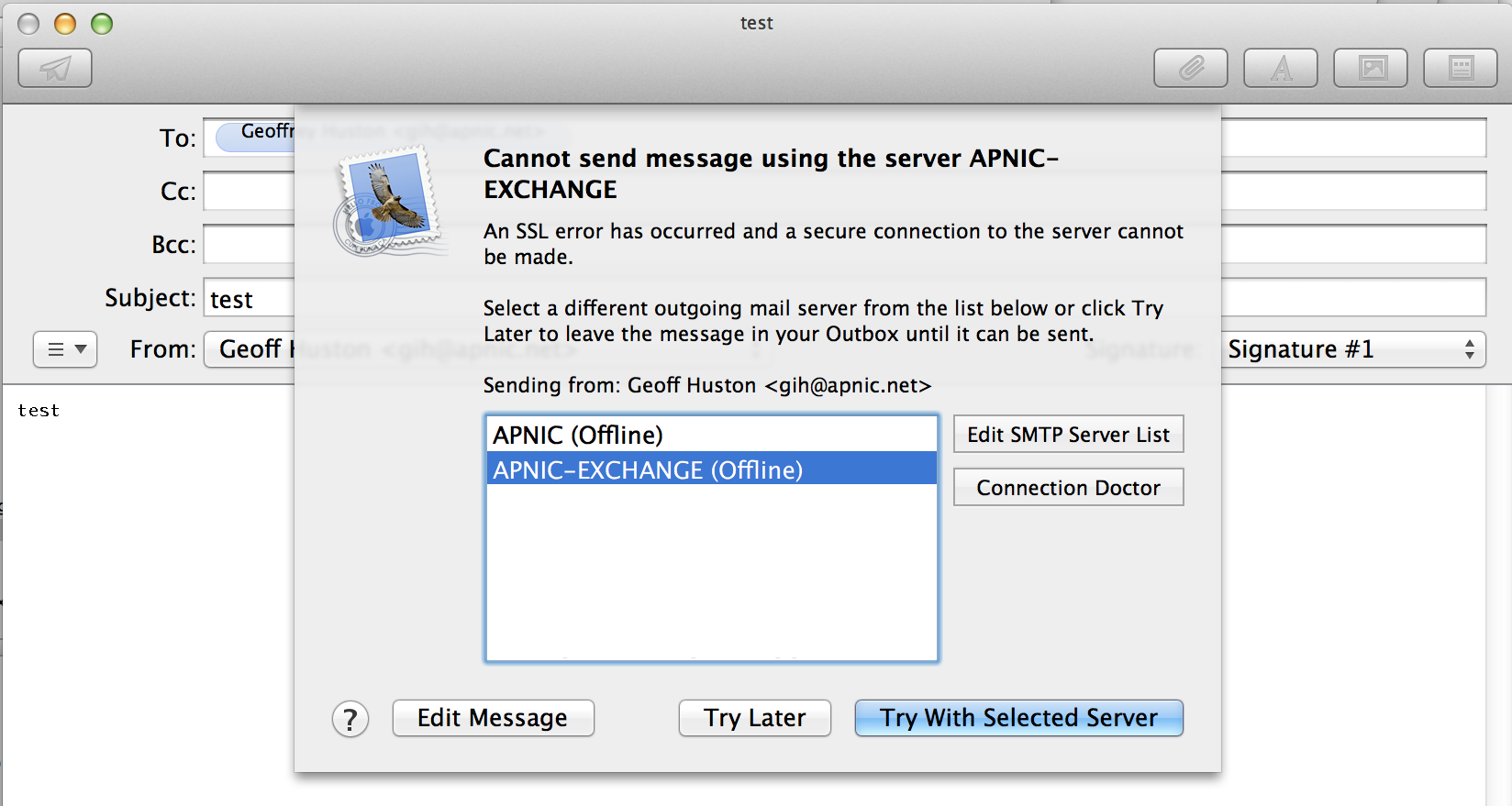 At APNIC we have changed our mail server configuration in the past few months, and are now using a mail server from Microsoft, namely the Exchange Server. These days for mail I use a Mac laptop, and use Apple's Mail application for my mail. To collect my mail I use IMAP, and to send my mail I use STMP, both standard protocols. These days security can't be ignored so we use TLS for channel encryption. All pretty standard stuff.