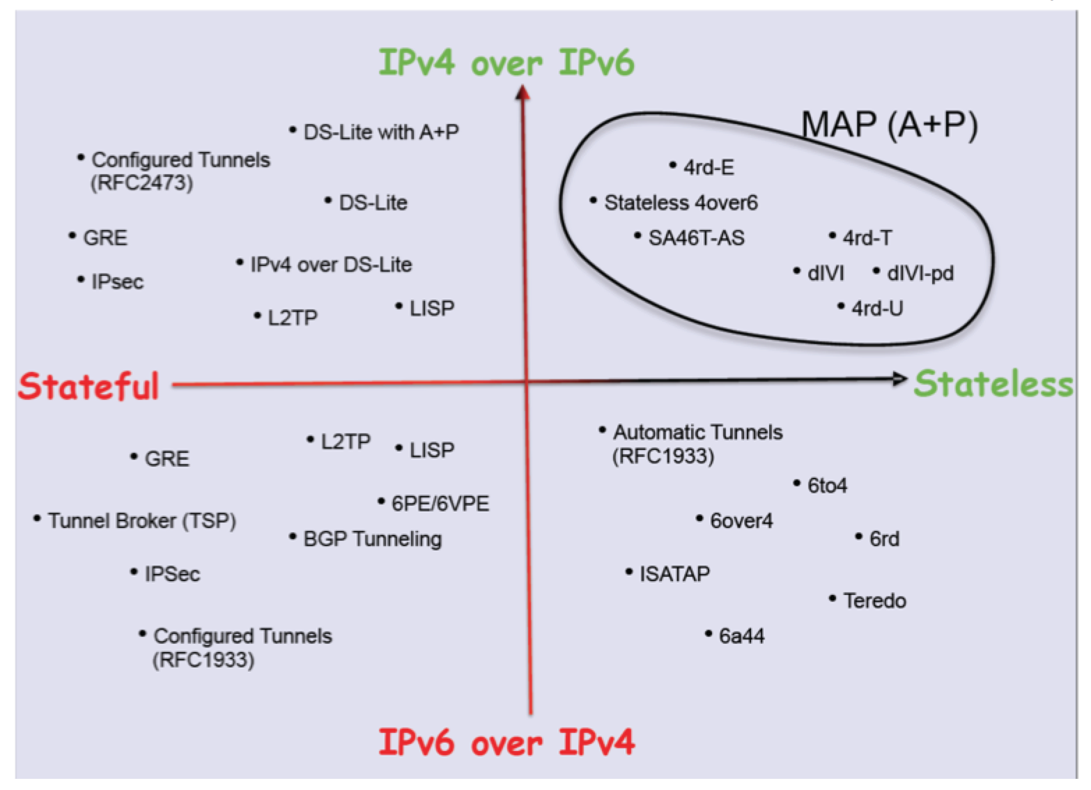One possible taxonomy of such transition technologies in shown in the following figure (Randy Bush, APOPS Presentation, 2012)