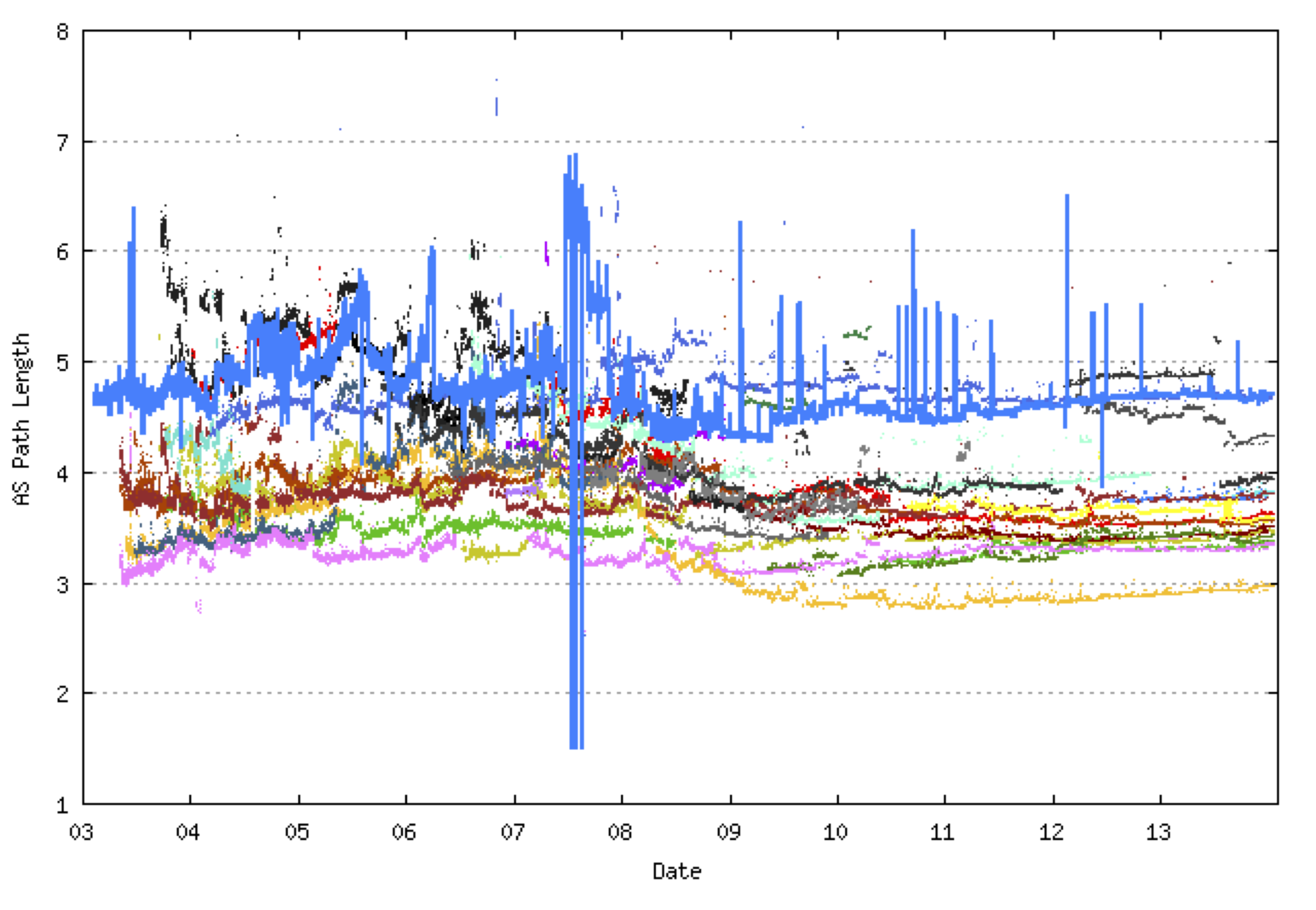 BGP is a distance vector routing protocol. This family of routing protocols operates through an iterative process where every BGP speaker informs all neighbouring BGP speakers of its selected best path to a destination. When a BGP speaker obtains an update from its neighbor, it compares the updated information with its current selected best path, and if this information causes the local BGP instance to select a new best path, then it informs its neighbours of this new choice. BGP, like all distance vector routing protocols, can be a very chatty protocol, and the larger the population of BGP speakers, and the denser the level of inter-connectivity between BGP speakers, the greater the potential amount of protocol updates that will occur across the network before it converges to a coherent common state. And of course as the Internet grows, this precisely what is happening to BGP. More Autonomous Systems are being added to the routing system, and the level of interconnectedness continued to rise, as evidenced by the relatively stable position of the average AS path length over time.