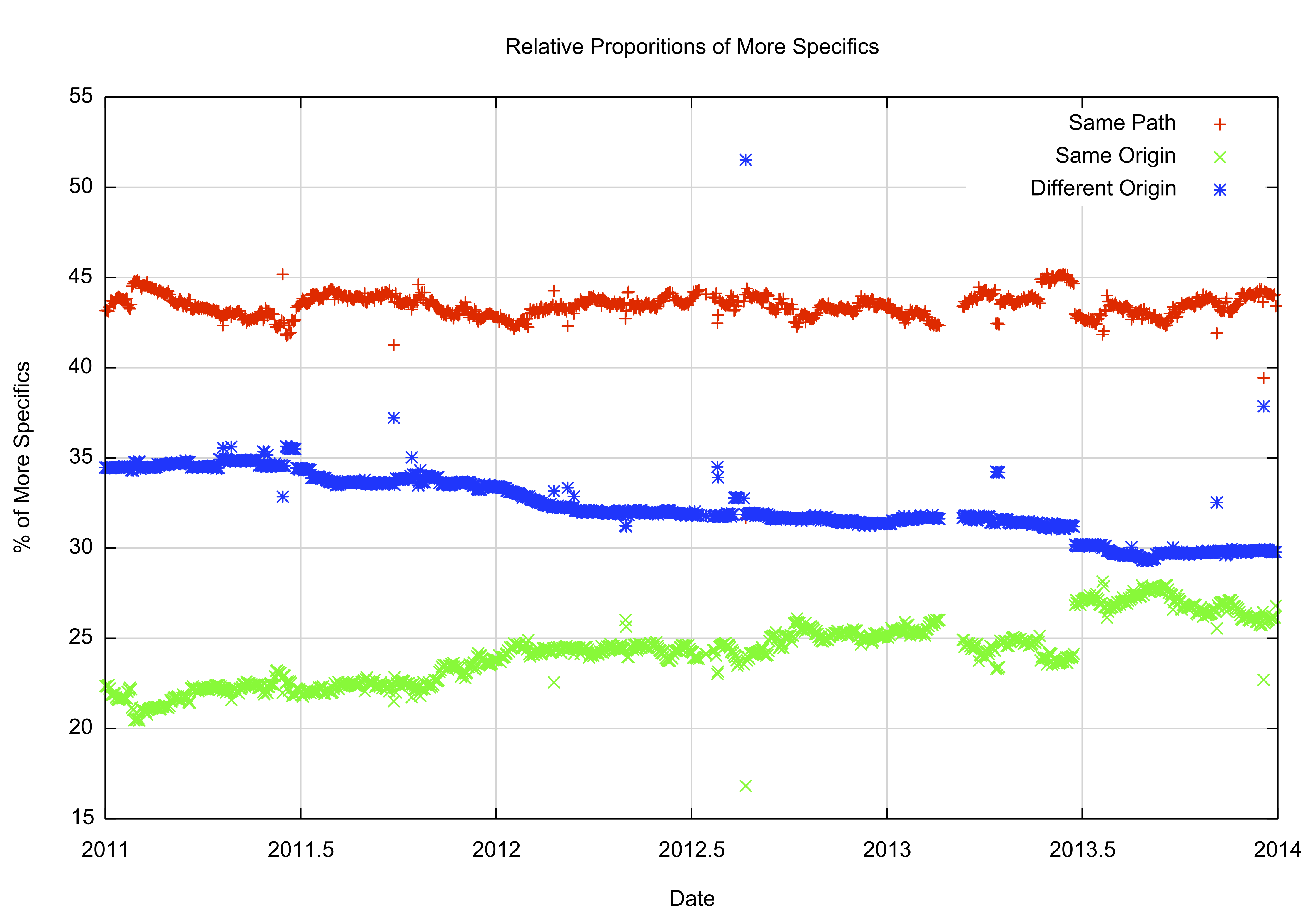 The relative number of same path more specifics has remained steady at some 45% of the total number of more specifics throughout this three year period, while the relative proportion of traffic engineering prefixes (same Origin AS) has risen from 21% to 26%, with a corresponding fall in the number of “hole punching” (different Origin AS) more specifics.