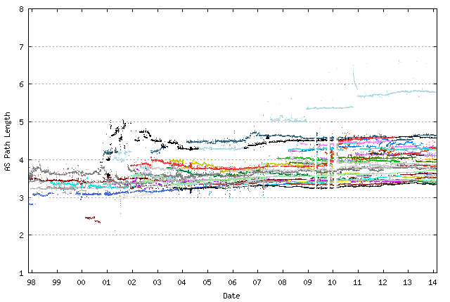 Why are we seeing this long term stability in the protocol convergence profile for BGP? What aspect of the Internet’s inter-AS topology, coupled with the behavior of BGP, could cause this? The answer lies in part on the widespread use of the MRAI interval, which effectively damps out the propagation of path hunting behavior following a withdrawal at source. The second part of the answer lies in the relatively constant “diameter” of the inter-AS space. Because path hunting behavior tends to produce an exploration of possible paths of AS path length n, then n+1, n-2, and so on, then if the AS Path length is bounded in size, then the path hunting behavior is also bounded. And we have seen an extraordinarily stable average AS Path length in the internet for the past 15 year. Figure 6 shows the average AS path length as provided by each of the peers of Route Views since 1998. It tends to suggest that as the Internet grows, new AS connections tend to connect into the “core” of the Internet, rather than attach at the “edge” of the network, so that the growth can be expressed as an increase in the connectivity “density” in the inner transit parts of the network.