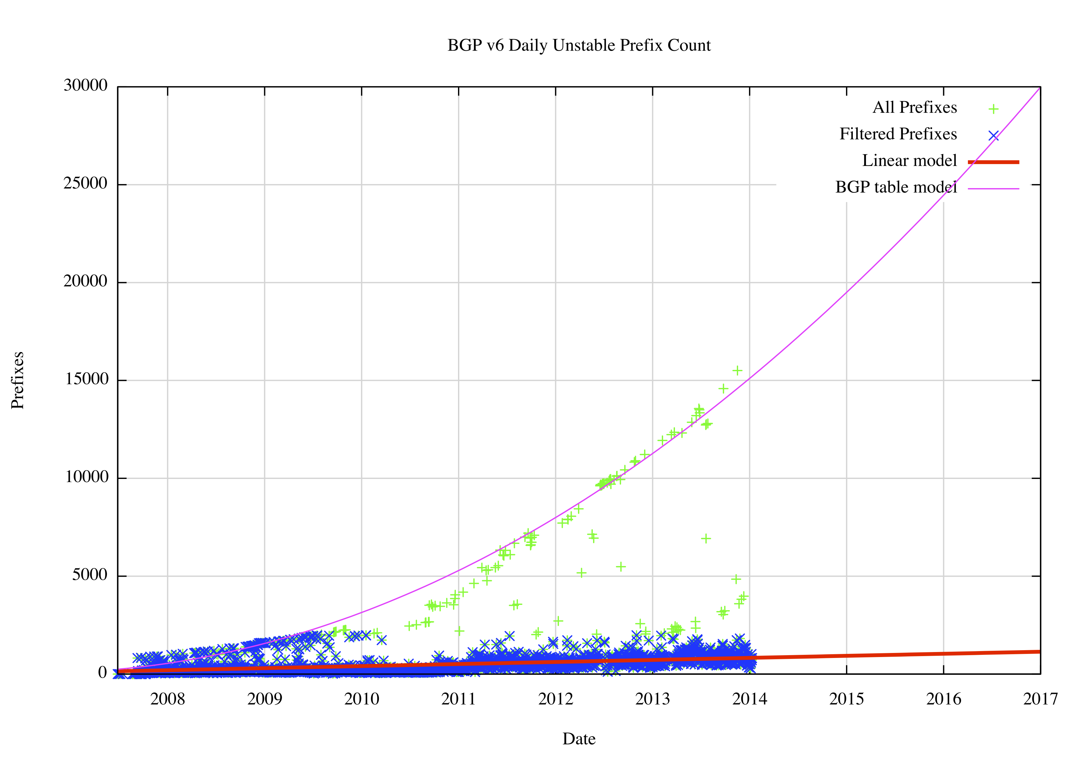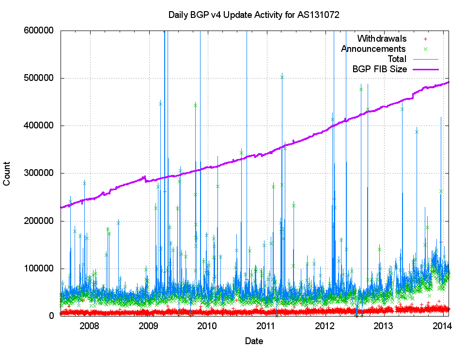 Last month, in January 2014, I reported on the size of the Internet’s inter-domain routing table, and looked at some projection models for the size of the default-free zone in the coming years. At present these projections are looking at relatively modest levels of growth of some 7 – 8% per year with IPv4. Although IPv6 is growing at a faster rate, doubling in size every two years, its relatively modest size of 1/30th of the size of the IPv4 routing table does not give cause for concern at the moment. But size of not the only metric of the scale of the routing space – it’s also what BGP does with this information that matters. As the routing table increases in size do we see a corresponding increase in the number of updates generated by BGP as it attempts to converge? What can we see when we look a the profile of dynamic updates within BGP, and can we make some projections here about the likely future for BGP?