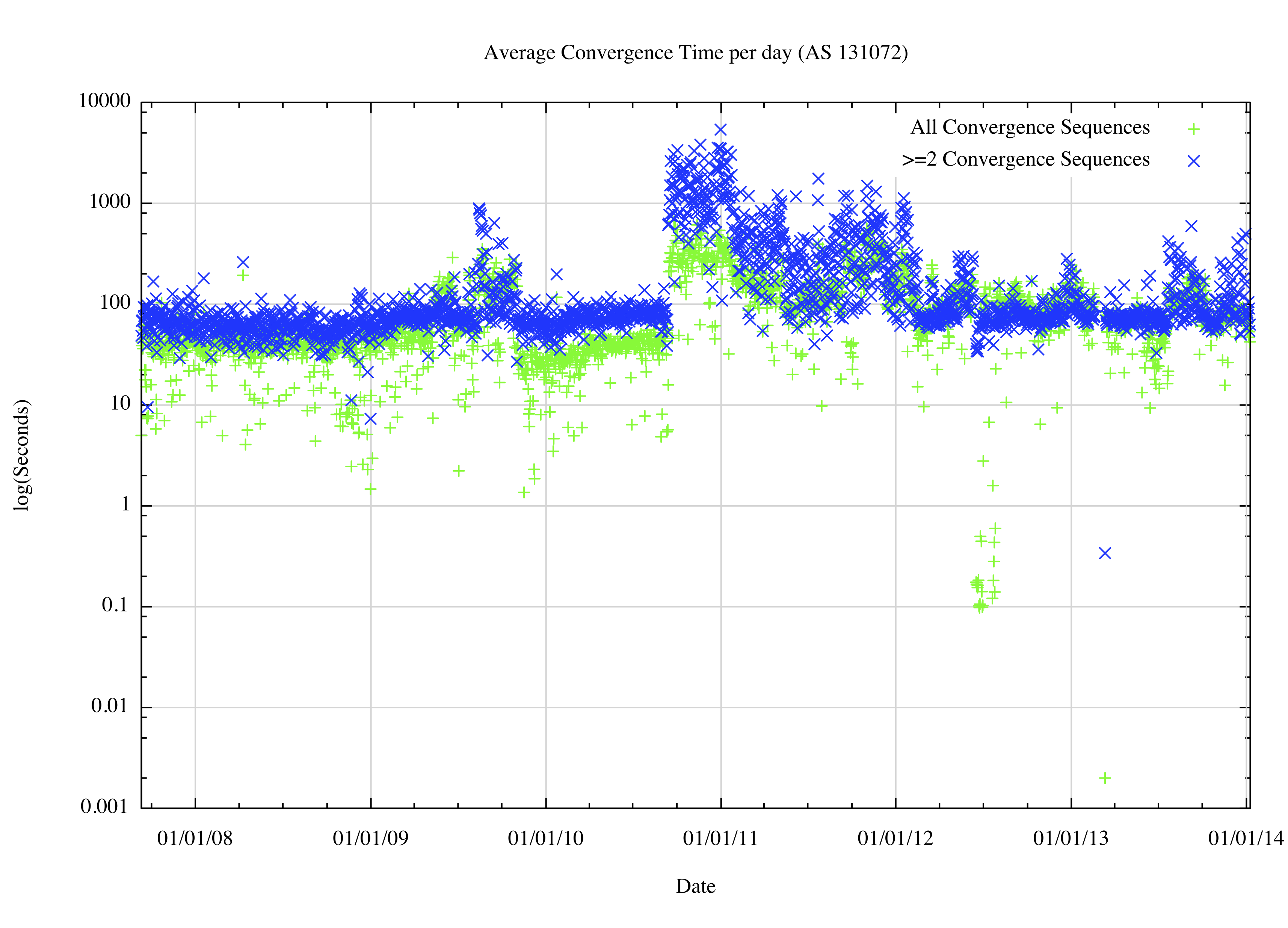 The conclusion from these observations is that the “amplification” factor of BGP updates has not played a significant role in inflating the workload of BGP over time. Each instability event generates some 2.4 updates on average, and as the spacing of updates is that of the MRAI interval, of 27 – 30 seconds, the average time for each routing convergence event is some 70 seconds.