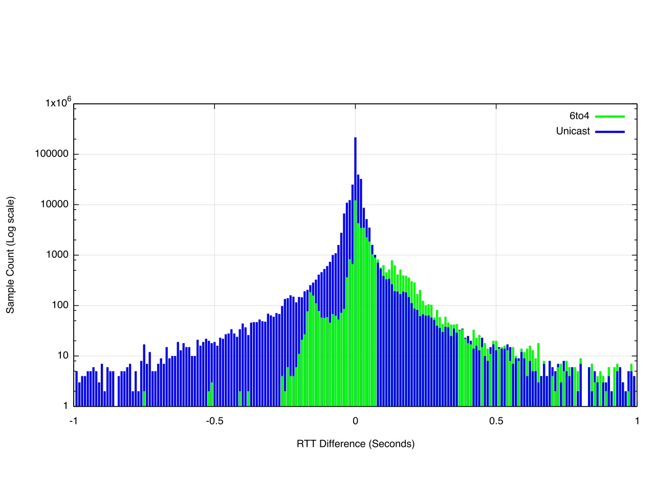 The Unicast IPv6 RTT is faster than IPv4 for 48% of the time, but more than 10ms faster only 18% of the time. Similarly, the Unicast IPv6 RTT is slower than IPv4 for 51% of the time, and is more than 10ms slower 25% of the time.