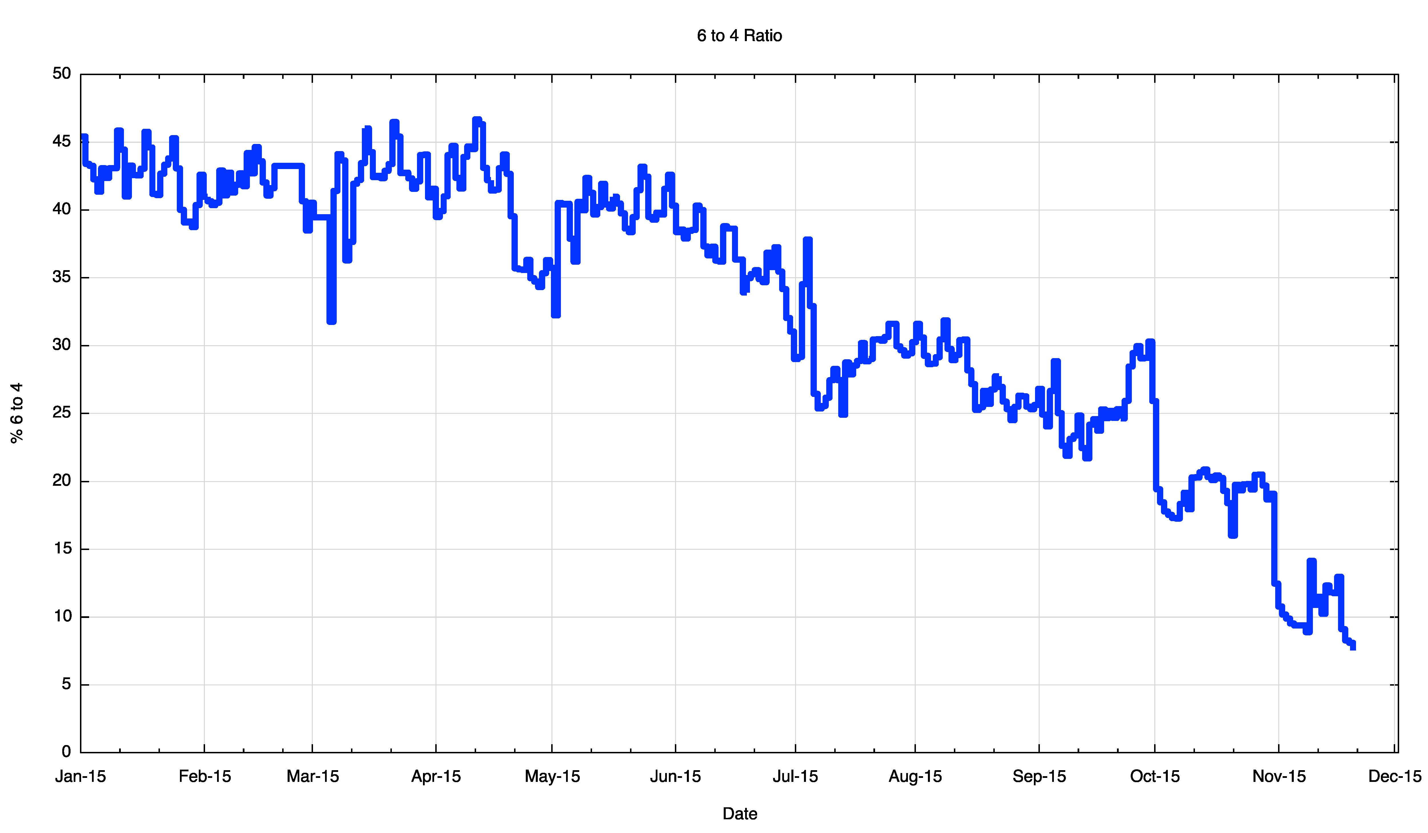 The IPv4 connection failure rate shows a steady decline over the year (Figure 6). The connection failure rate by mid November 2015 was 0.18%.