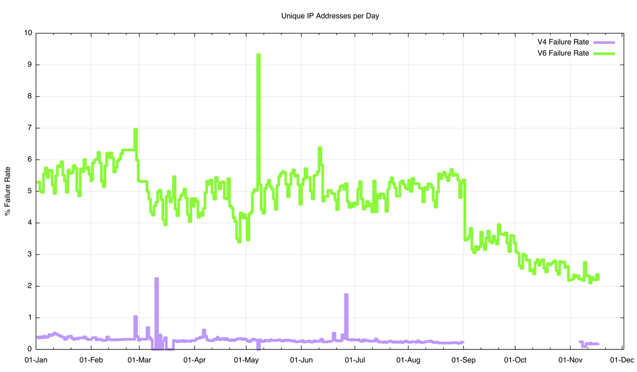 Figure 2 shows the daily connection failure rate across 2011, comparing IPv4 and IPv6. It’s striking that IPv6 was so bad at establishing connections, with a consistent record of some 40% of all connection attempts failing to complete. By comparison, the IPv4 failure rate was some 0.4%