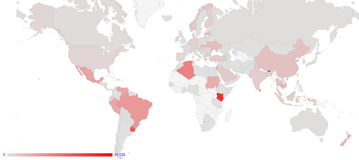 The other form of world map is obtained by selecting the Plot Type of “Failure of V6 TCP connections”. Here the data reflects the relative ratio of failed IPv6 connections as compared to all IPv6 connection attempts. The map shows the average connection failure rate expressed as a percentage of all seen connection attempts over the specified time window for users who are geolocated to a particular country. An example screen shot of this view is shown in Figure 3.