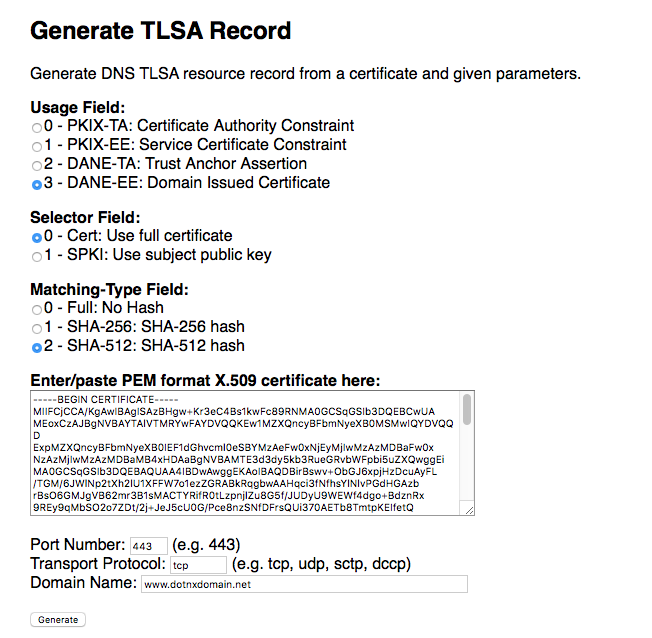 I chose to generate a TLSA record using a SHA-512 hash of the entire Let’s Encrypt Certificate. The response from this web page is the TLSA record to add to the zone file.