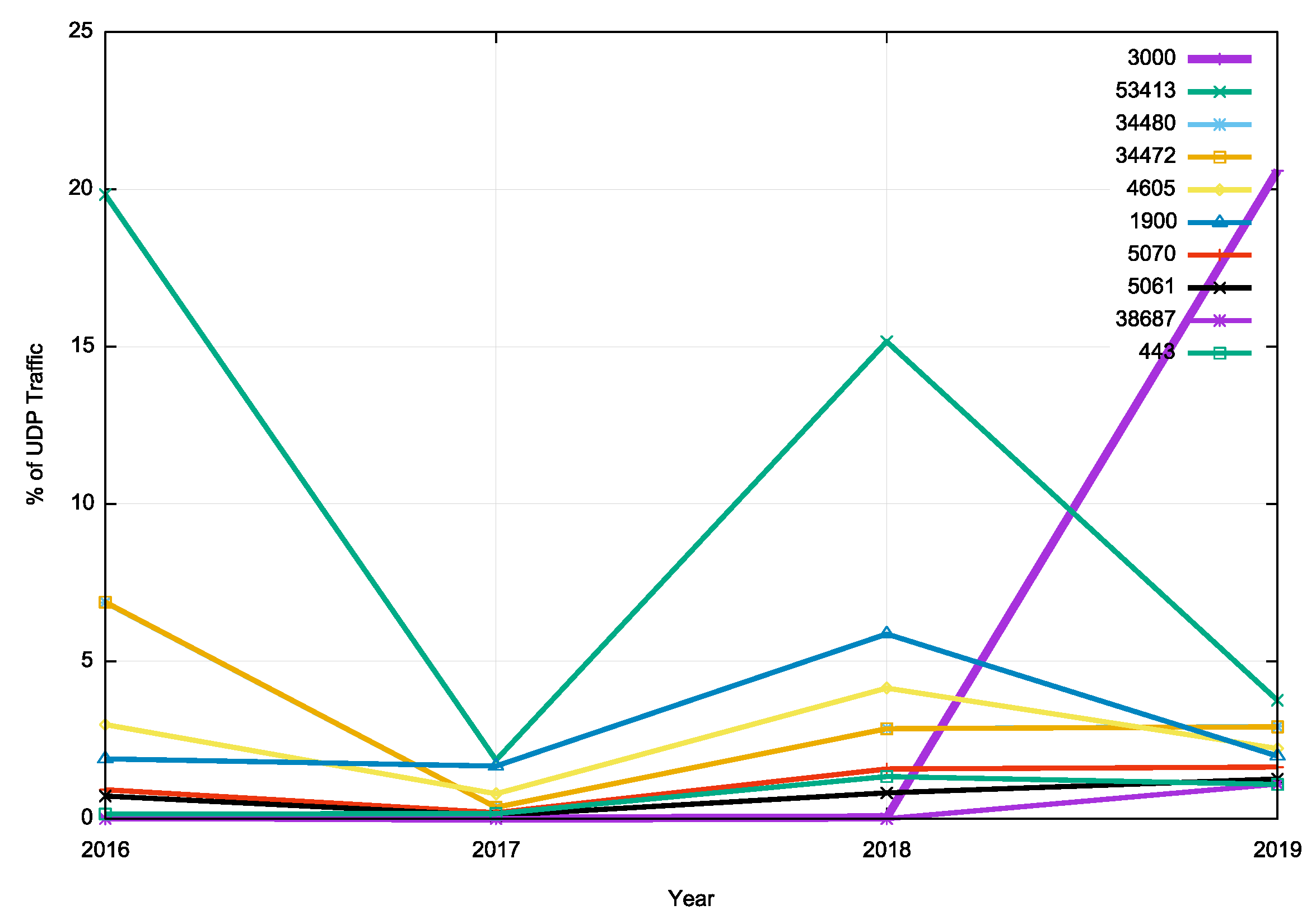 The UDP traffic profile is somewhat different and incoming UDP port 3000 traffic accounted for one fifth of all incoming UDP traffic in 2019 (Figure 8).