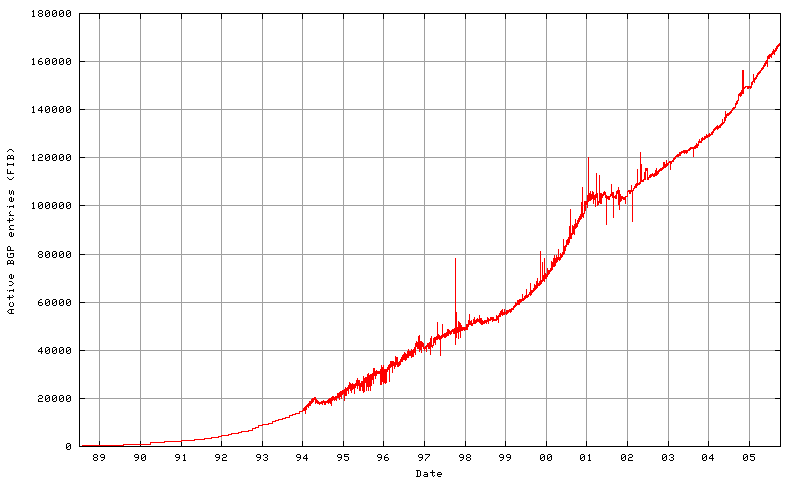 The initial characteristics of the routing table size from 1988 until April 1994 show definite characteristics of exponential growth. If continued unchecked, this growth would have lead to saturation of the available BGP routing table space in the non- default routers of the time within a small number of years.