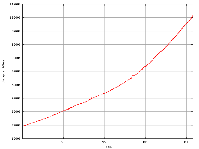 The number of unique ASes present in the BGP table has been tracked since late 1996, and the trend of AS number deployment over the past four years is also one that matches a compound growth model with a growth rate of 51% per year. As of the start of May 2001 there were some 10,700 ASes visible in the BGP table. At a continued rate of growth of 51% p.a., the 16 bit AS number space will be fully deployed by August 2005. Work is underway within the IETF to modify the BGP protocol to carry AS numbers in a 32-bit field. [8] While the protocol modifications are relatively straightforward, the major responsibility rests with the operations community to devise a transition plan that will allow gradual transition into this larger AS number space.
