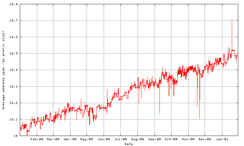 A similar observation can be made regarding the number of addresses advertised per AS. In December 1999 each AS advertised an average of 161,900 addresses (equivalent to a prefix length of /14.69, and in January 2001 this average has fallen to 115,800 addresses, an equivalent prefix length of /15.18.