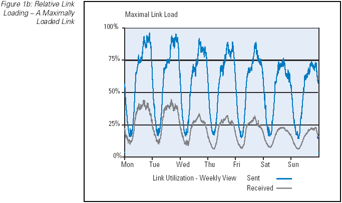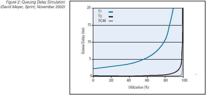 The most basic tool for measuring network performance is the periodic measurement of the interface byte counters. Such measurements can provide a picture of the current traffic levels on the network link, and when related to the total capacity of the link, the relative link loading level can be provided. As a performance indicator this relative link loading level can provide some indication of link performance, in that a relatively lightly loaded link (such as a load of 5 to 10 percent of total available capacity) would normally indicate a link that has no significant performance implications, whereas a link operating at 100 percent of total available capacity would likely be experiencing high levels of packet drop, queuing delay, and potentially a high jitter level. (Figure 1) In between these two extremes there are performance implications of increasing the load. Of course it should be noted that the characteristics of the link have a bearing on the interpretation of the load levels, and a low-latency 10-Gbps link operating at 90-percent load will have very significantly lower levels of performance degradation than a 2-Mbps high-latency link under the same 90-percent load. (Figure 2)