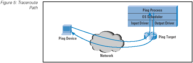 Of course, it is possible to interpret too much from ping results, particularly when pinging routers within a network. Many router architectures use fast switching paths for data packets, whereas the central processing unit of the router may be used to process ping requests. The ping response process may be given a low scheduling priority because router operations represent a more critical router function. It is possible that extended delays and loss, as reported by a ping test, may be related to the processor load or scheduling algorithm of the target router processor rather than to the condition of the network path. (Figure 4)