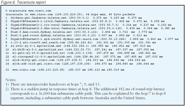 Like ping, traceroute measures the elapsed time between the packet transmission and the reception of the corresponding ICMP packet. In this way, the complete output of a traceroute execution exposes not only the elements of the path to the destination, but also the delay and loss characteristics of each partial path element. Traceroute also can be used with loose source route options to uncover the path between two remote hosts. The same caveats mentioned in the ping description relating to the relative paucity in deployment of support for loose source routing apply. An example of a traceroute report is shown in Figure 6.