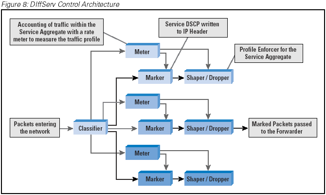 Solutions exist in both the passiveand active polling domains. In the case of SNMP there is a monitoring framework (or Management Information Base, MIB) relating to the Differentiated Services (DiffServ) model of Quality of Service (QoS), and also MIBs relating to the Integrated Services (IntServ) QoS model. For the DiffServ MIB, it is first necessary to define an abstract model of the operation of a DiffServ admission router, by looking at the major functional blocks of the router. The first of these blocks is the definition of the supported behavior aggregates provided by the network. Within the network path, the initial active path element is the traffic classification module, which can be modeled as a set of filters and an associated set of output streams. The output stream is passed to the traffic-conditioning elements, which are the traffic meters and the associated action elements. Many meter profiles can be used in the model: an average data rate, an exponential weighted moving average of one of numerous various traffic profiles that can be expressed by a set of token-bucket parameters using an average rate, a peak rate, and a burst size. More elaborate meter specifications can be constructed using a multilevel token-bucket specification. From the meter, the traffic is passed through an action filter, which may mark the packets and shape the traffic profile through queues or discard operations. Together, this sequence of components forms a traffic conditioning block . The traffic is then passed into a queue through the use of a queuing discipline that applies the desired service behavior. (Figure 8)