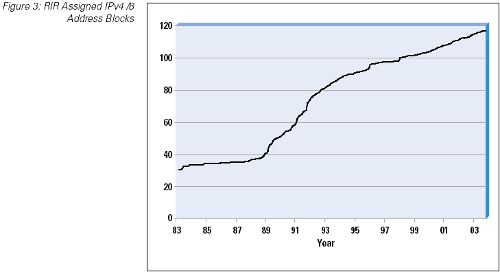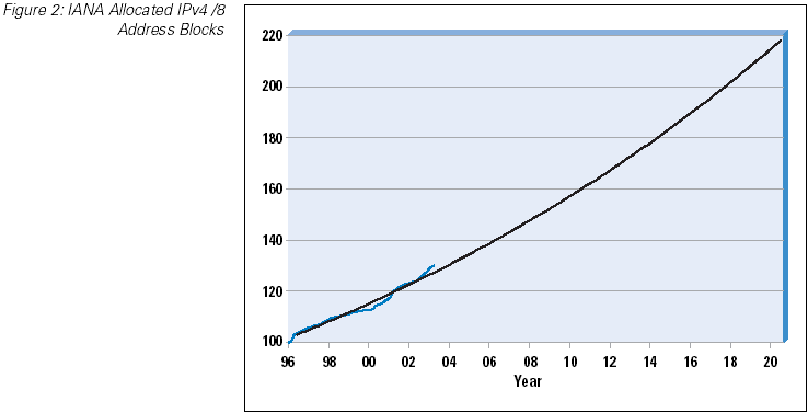 It is worth a slight digression into the method of projection being used here. The technique is one of using a best fit of an exponential growth curve to the data. The underlying assumption behind such a projection is that the growth rate of the data is proportional to the size of the data, rather than being a constant rate. In network terms, this assumes that the rate of consumption of unallocated addresses is a fixed proportion of the number of allocated addresses, or, in other words, the expansion rate of the network is a proportion of its size, rather than being a constant value. Such exponential growth models may not necessarily be the best fit to a network growth model, although the data since 1995 does indicate an underlying exponential growth pattern. Whether this growth model will continue into the future is an open issue.