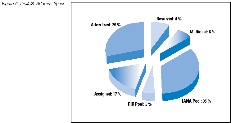 The data as of October 2003 shows that some 29 percent of the total IPv4 address space is announced in the Border Gateway Protocol (BGP) routing table, whereas 17 percent has been allocated to an end user or LIR but is not announced on the public Internet as being connected and reachable. A total of 5 percent of the address space is held by the RIR's pending assignment or allocation (or at least there is no RIR recorded assignment of the space), while 35 percent of the total space remains in the IANA unallocated pool. A further 8 percent of the space is held in reserve (Figure 5).